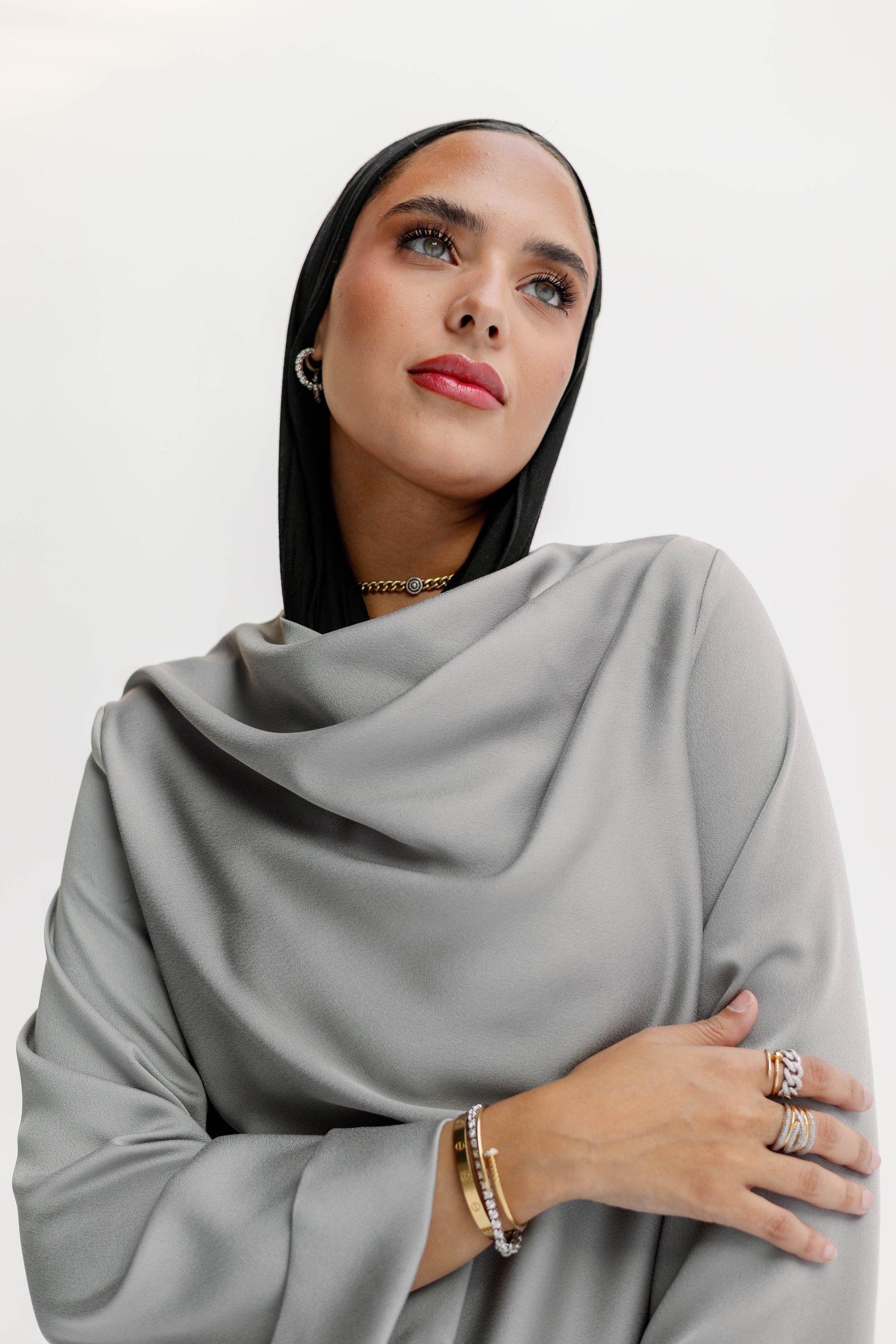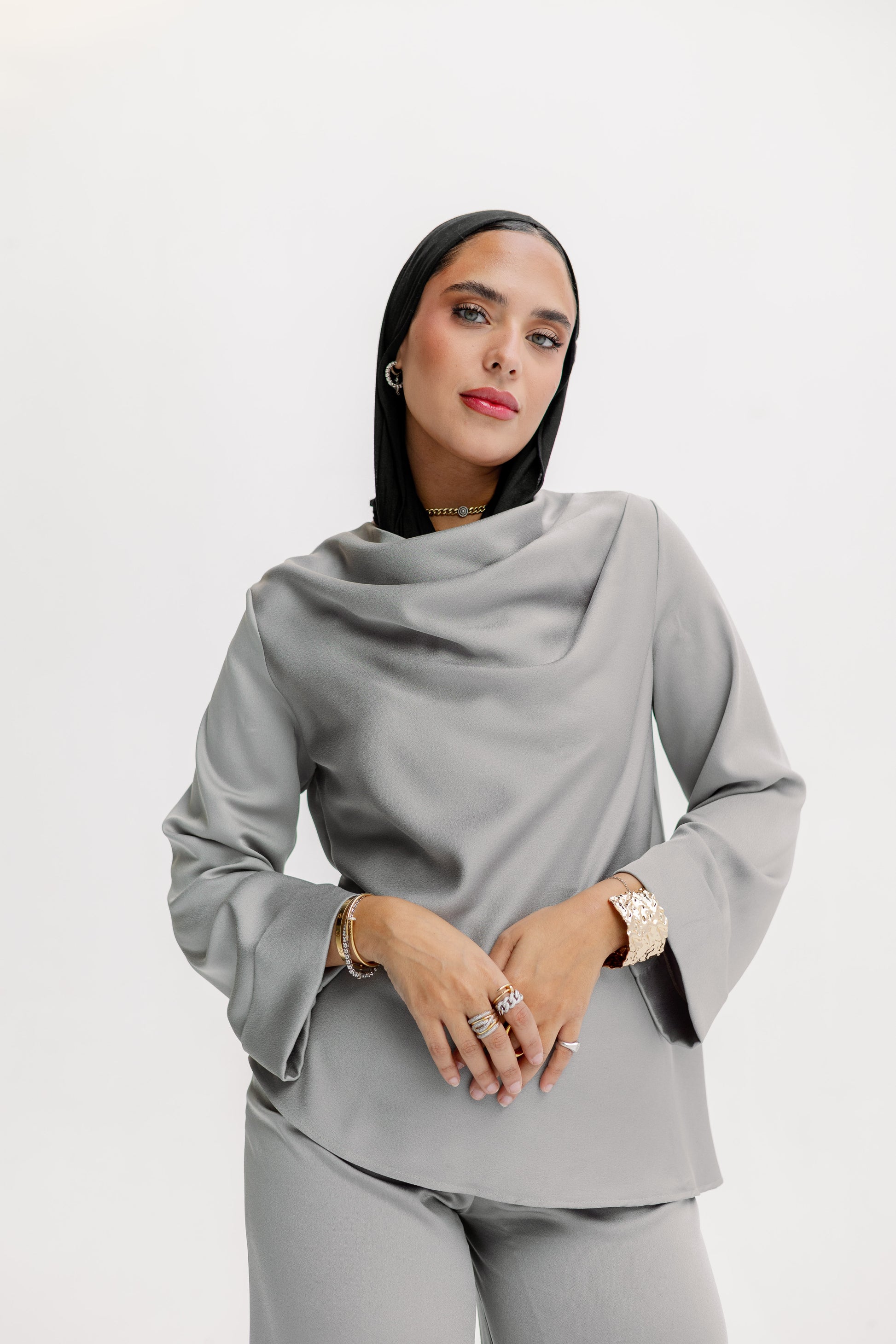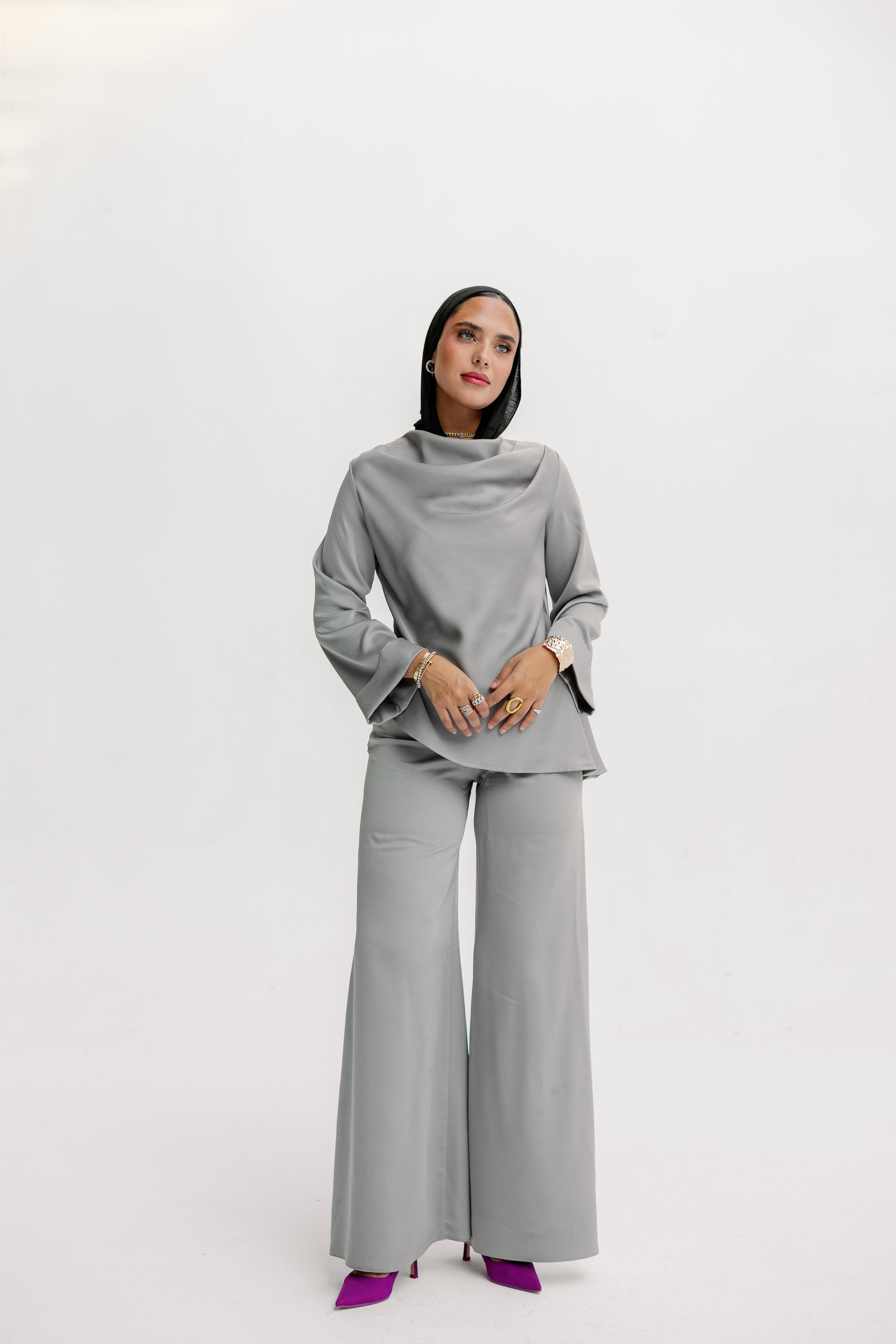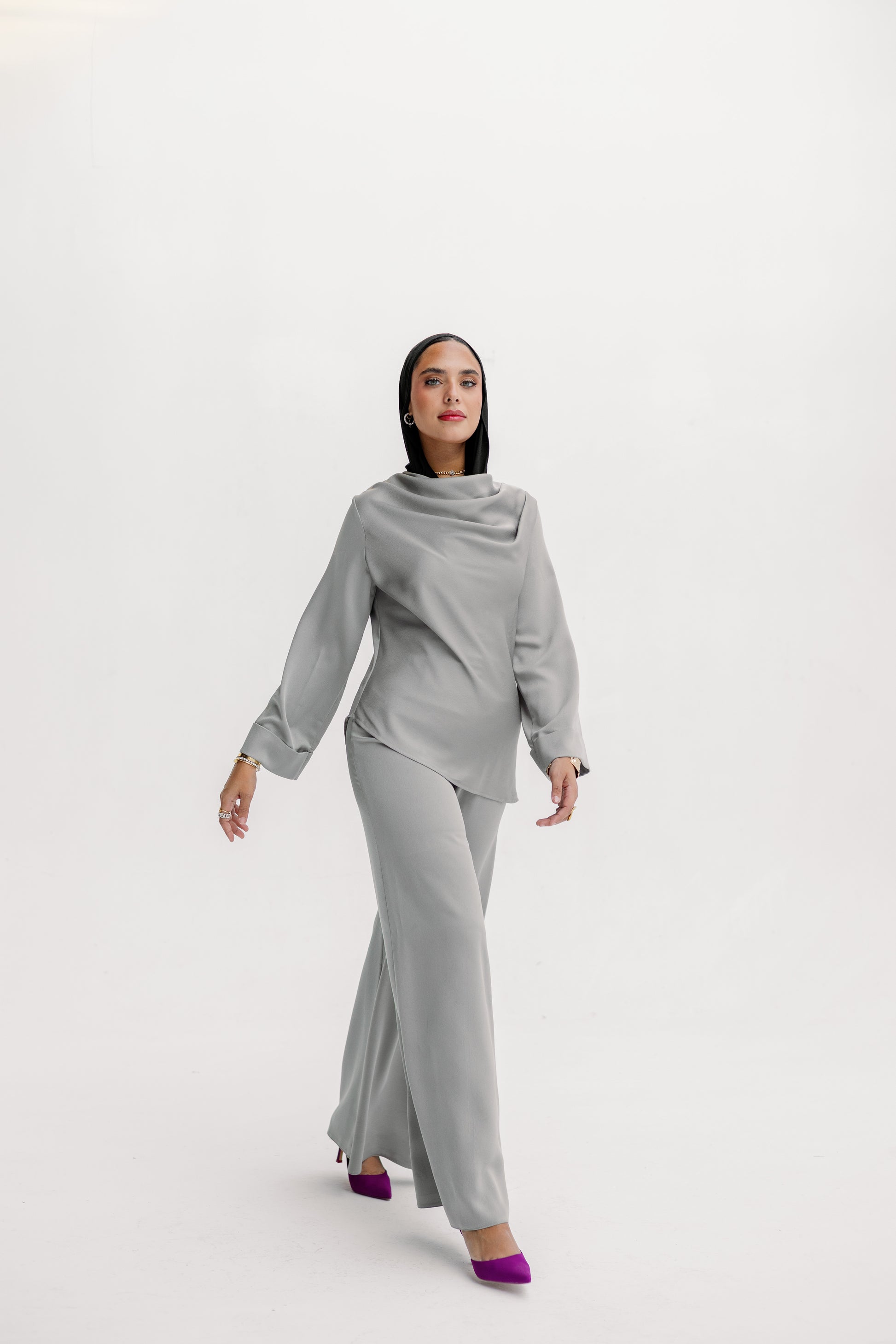 A satin co-ord designed for ease and movement. The softly draped top falls fluidly across the neckline, creating a relaxed yet polished silhouette, while the wide-leg pants balance the look with an effortless flow. Thoughtful in cut and comfortable to wear, this set transitions seamlessly from day to evening, styled together or worn as separates.